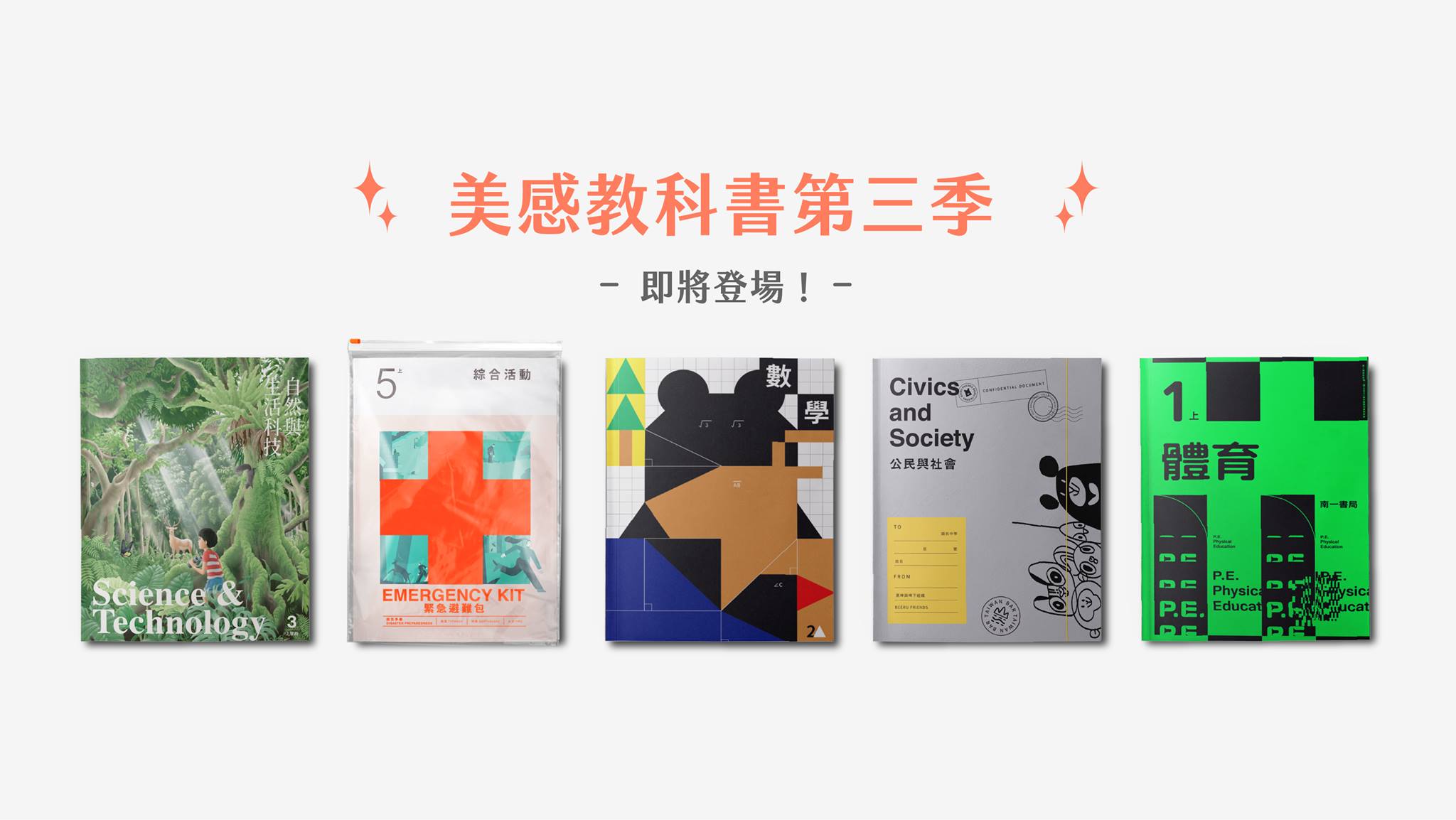 這次的「美感教科書第三季」,從國小到國中橫跨各領域,打造全新五本課本:小三自然、小五綜合、國七體育、國八數學、國八公民。此次由五大陣容設計團隊參與,包含三頁文、Bito、無⽒製作、臺灣吧以及⽇⽬。以一科目一設計與主題性的方式深入設計,創造出新穎的風格,更貼近我們的生活。