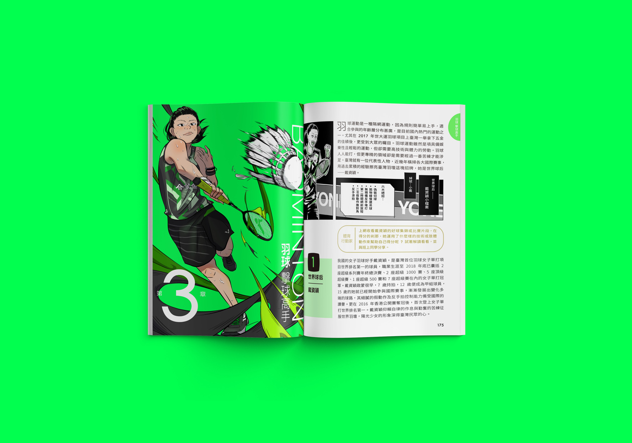 回顧過去我們的求學經驗,我們都認為學體育是戶外體驗,一學期過了體育課本一頁都沒翻過,產生學生對於體育課本的不重視。日目這次決定打破舊式觀念,使用螢光綠的配色與漫畫的方式呈現,吸引學生的興趣增加學生對於書本上的參與感。