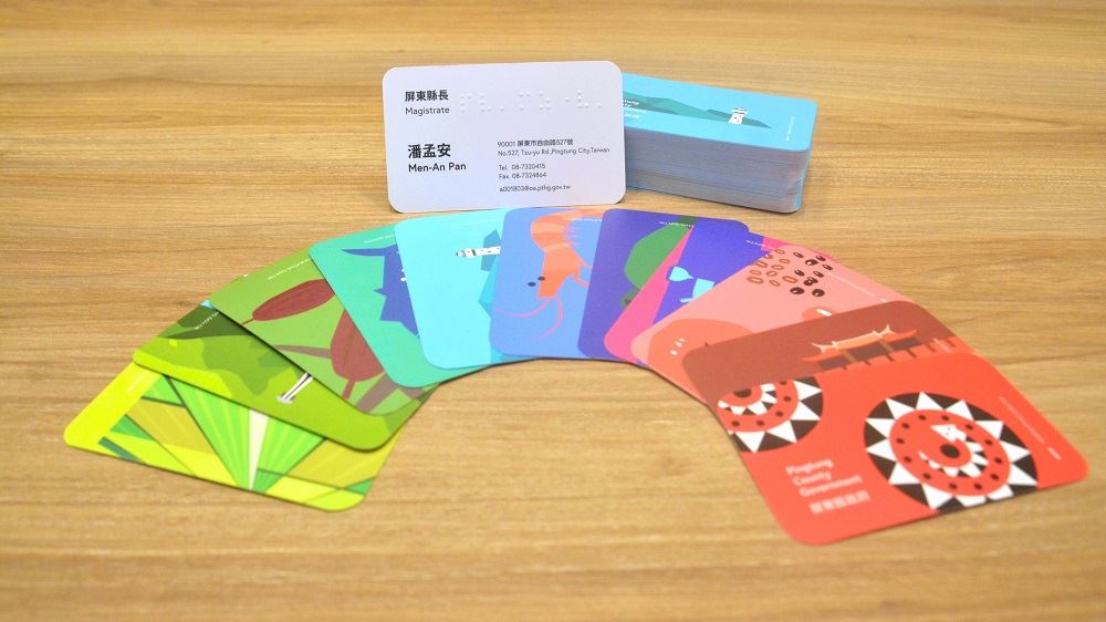 而這次屏東縣政府的名片美感大大再升級,有別於過往統一設計,既簡易又單調,想和他人交換名片都需猶豫個幾秒。這次的設計讓人迫不及待互相交換名片蒐集一波,選用了14種具在地特色的代表性圖樣,以人文、景點、農特產做為設計構想,其中包含蓮霧、芒果、可可、黑鮪魚、蝦子及稻田來表達富饒的農漁產業,客家藍衫、原民圖騰、眷村紅門則代表多元文化,再加上景點山川琉璃吊橋、溫泉、燈塔、綠蠵龜、恆春城門,交換名片之餘還能認識屏東行銷屏東!