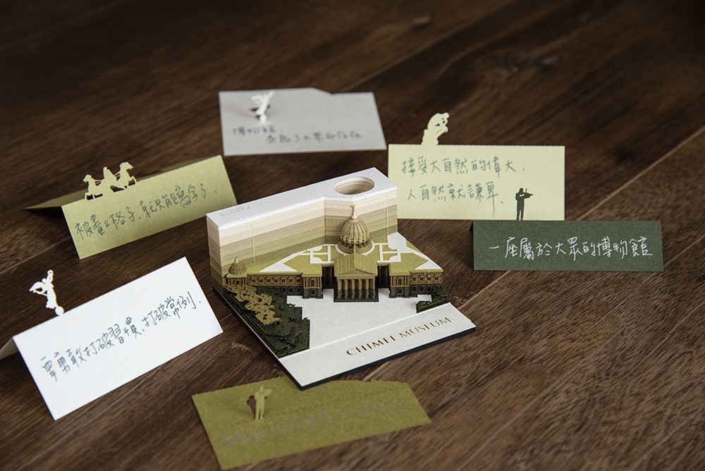 這款OMOSHIROI BLOCK紙雕模型便條紙「奇美博物館」,以森林中的博物館為設計概念,使用高級日本和紙,利用不同的綠色色階,完美還原博物館本體,同時還設計了館內收藏的幾個重點藏品:阿波羅噴泉、榮耀天使、沉思者與許文龍先生拉琴的剪影。每張紙都經過嚴謹精細的計算,隨著將一張又一張便條紙撕掉,精緻的奇美博物館將一點一滴地出現於林樹間。