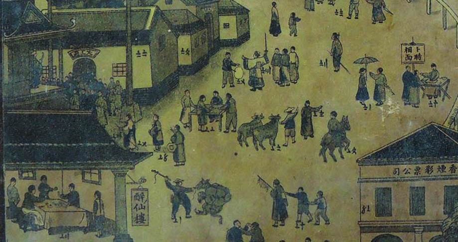 僅以短短兩句經文就能設計出這麼多彩的畫面,令人不禁想問:作品有沒有範本?畫家是誰,是華人或外國人?據聖教書會年報記載,「周之楨(Chow Chih-chen,1861—1933)」曾經是「重繪」的作者」,(2)不過在這之前是否還有其他畫家就暫時不可得知,另外,也確實有範本可供聖教書會描摹。《寬窄路圖》最早由1866年德國萊倫(Charlotte Reihlen, 1805-1868)構思、夏哈(Conrad Schacher, 1831-1870)繪製,後來在尼德蘭、英國都各有不同版本。(3)而至今,除了在臺灣,在瑞士、挪威、美國、澳大利亞等地,也都典藏有穿長袍馬褂人物的中國化《寬窄路圖》版本。(4)先不談這錯綜複雜的承傳關係,比對歐美與中式版本的畫面【圖4】,不難發現聖教書會的中式版本作了許多母題上的調整,如原本的馬車成了人力轎;露天酒館換作醉仙樓等,細節繁多有趣,貼近當地生活。這些母題的置換是為了避免東西文化差異所導致當地觀者在理解上的障礙,同時加強日常性的親切感。因此,在《寬窄路圖》中便出現了當時中國流行的洋傘、鴉片煙(清香齋煙館)、彩票(香煙彩票公司),以及傳統習俗如廟宇道士、風水卜卦(包選陰宅、卜時相面)等圖像,而這些景象多是安排在通往「滅亡」的寬路中。