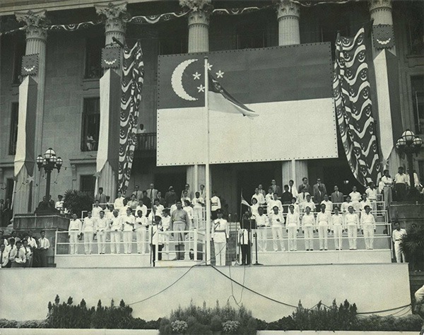 【圖 1】1965年於市政大廈(City Hall)前階梯,首次舉辦升旗典禮。圖版來源:National Gallery Singapore: