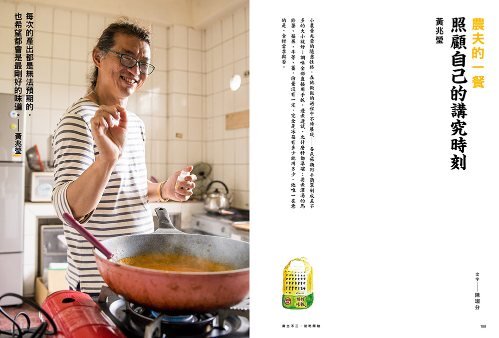 一般人也許想像長時間與農作物在一起的農夫,應該是含蓄不擅長言辭的。然而書中介紹的花蓮的這一群實踐者很特別,他們平日以有機友善耕作的方式善待人與食物,農閒時也接待體驗行程,他們原本是科技業、服務業、老師、社工,甚至是修行者,對於人與環境充滿關心,所以很希望能跟大家一起來關心「吃」這件事。