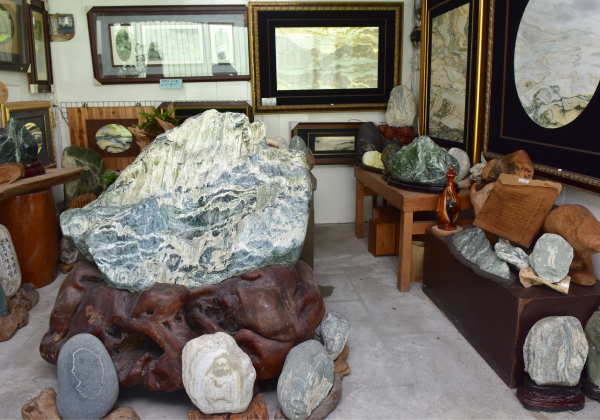 東海岸得天獨厚的自然環境,培養出一群賞玩奇石的花蓮人。自從石藝大街設立,他們能有地方好好創作與分享所愛。簡定義收集許多市面上罕見的玉石畫,像是一幅幅掛在牆上的「光畫」,玉石本身自然的紋路,在燈光相襯下,讓人聯想到東部特有的峽谷景觀,剔透的溪水配上黃昏,令人駐足遐想。