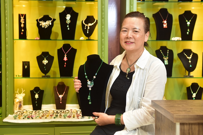 有別於石藝大街店家多以玉石為主,屋裡商行則是流行的琉璃飾品,這裡不僅是適合閒逛的小店,更是老闆方鈺鈞的母親,人稱淑華姐的設計工作室。
