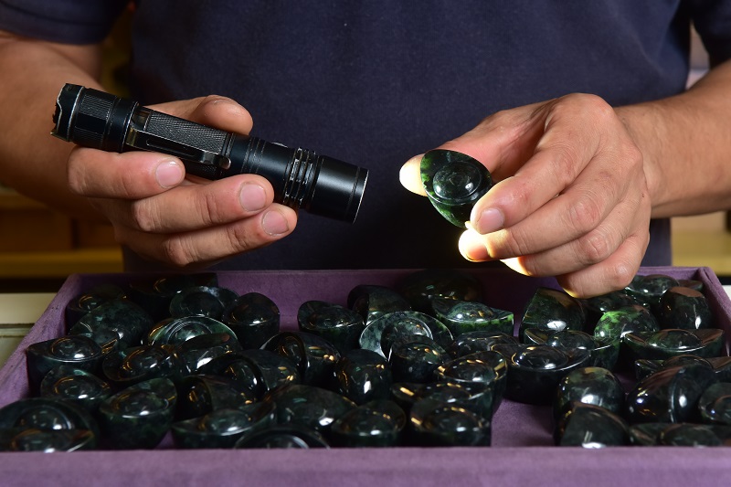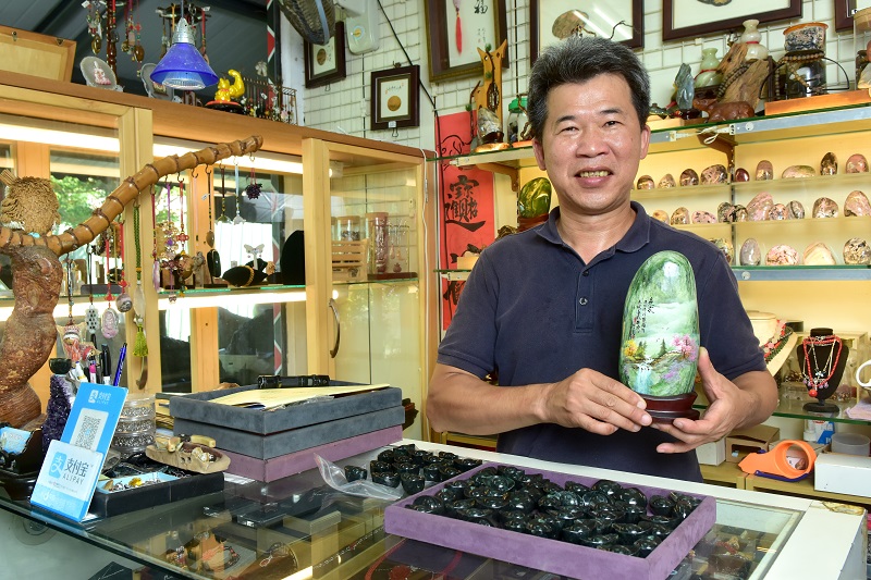 趁著空檔,老闆廖錦龍專心在石板上勾勒裁切邊,特別注意避開石材的裂紋或瑕疵,隔天進工廠才能磨出漂亮的成品;他的一日生活由工廠加工開始,然後到石藝大街的店面做生意。這裡的商品以玫瑰石、墨玉和菊花玉為主,因為這三種石材容易取得,薄利多銷也是種行銷模式。