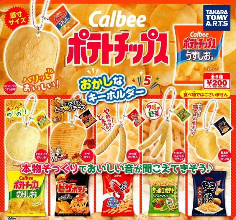 Calbee洋芋片吊飾第六彈預備上市,這次的造型不僅與實際洋芋片的尺寸、顏色一模一樣,就連紋路以及表面的調味粉都做得相當精緻,將洋芋片的金黃酥脆完美呈現。Calbee的超擬真洋芋片扭蛋,,讓人忍不住想