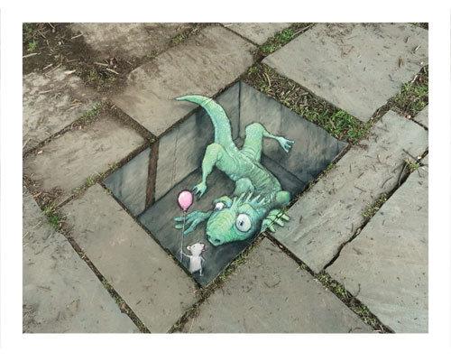 隨著現代人腳步越走越快,我們越來越少機會去欣賞、觀察我們的城市,特別是那些比較破落的街邊角落。然而一位來自美國密西根州的粉筆藝術家David Zinn,他致力於在我們的腳下創造藝術。一個人,一盒粉筆就